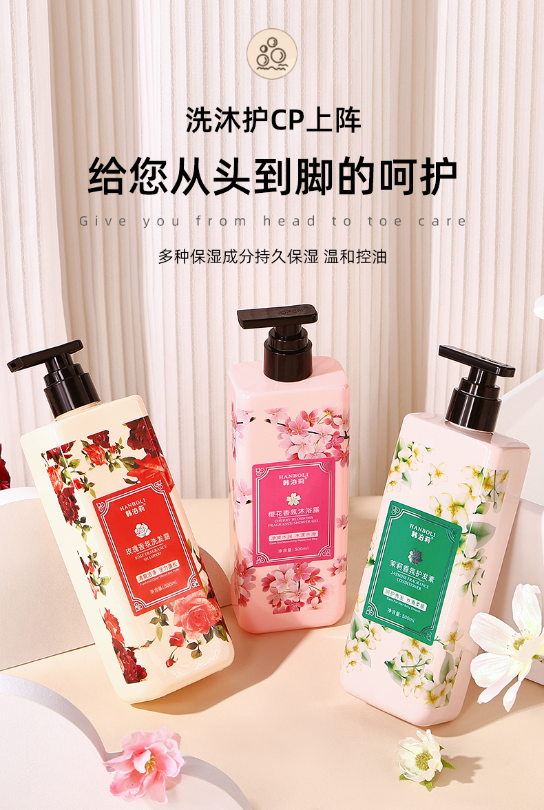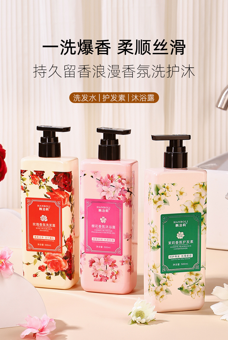 【3件套-包邮】韩泊莉洗护沐滋养柔顺花香洗发水护发素沐浴露去油净爽留香成人500ml*3