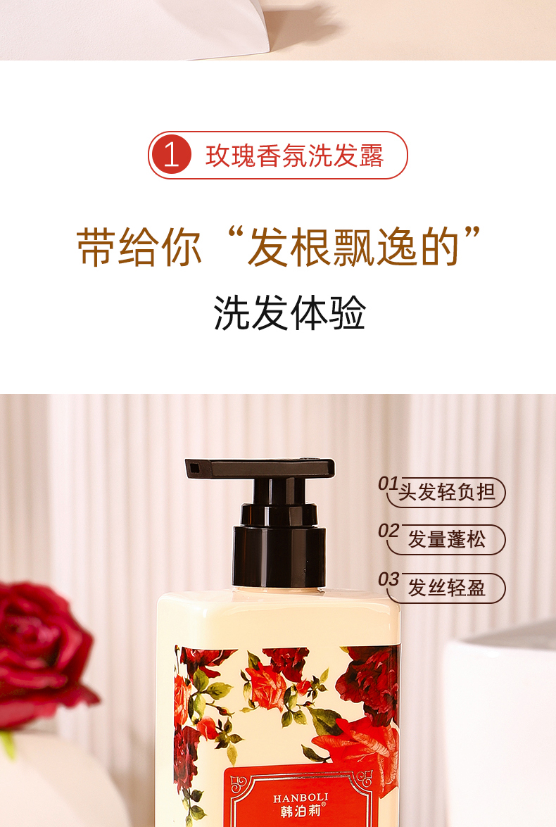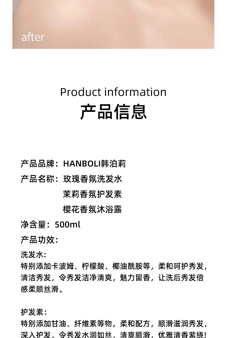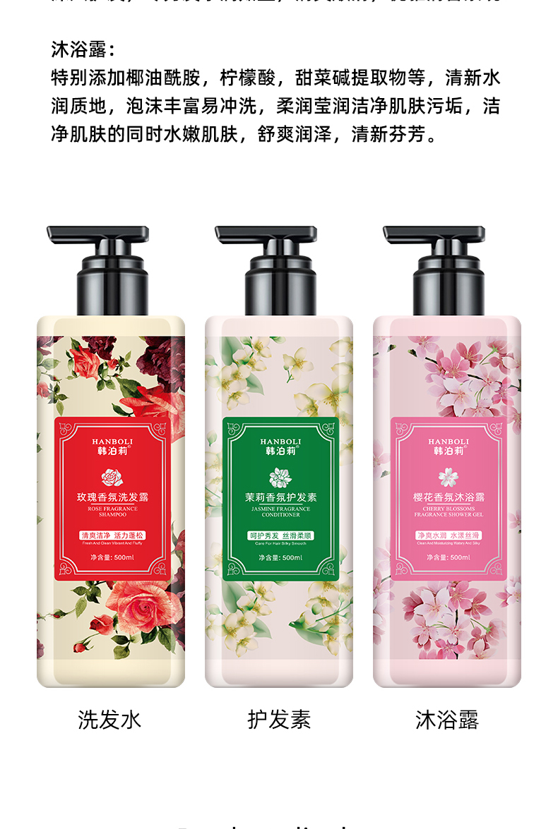 商品名称:【3件套-包邮】韩泊莉洗护沐滋养柔顺花香洗发水护发素沐浴露去油净爽留香成人500ml*3