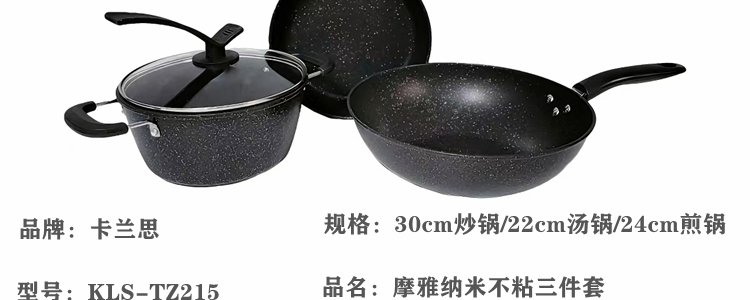 商品名称:卡兰思 摩雅纳米不粘锅三件套 炒锅30cm+汤锅24cm+煎锅24cm