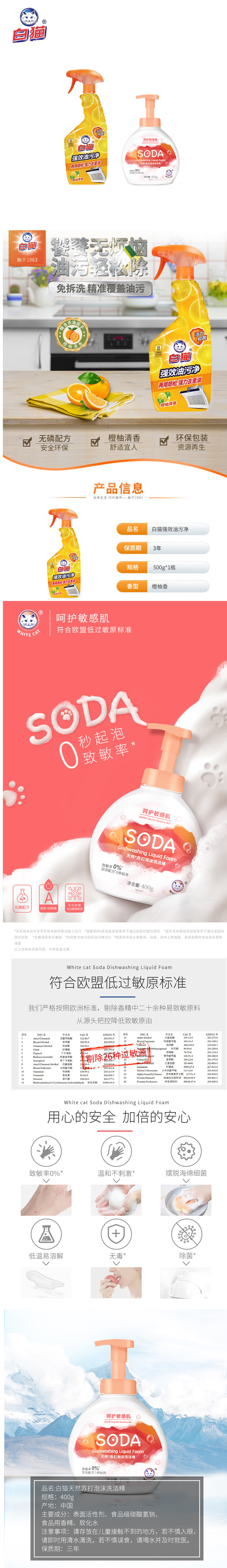 商品名称:白猫天然苏打泡沫洗洁精400g+强效油污净500g