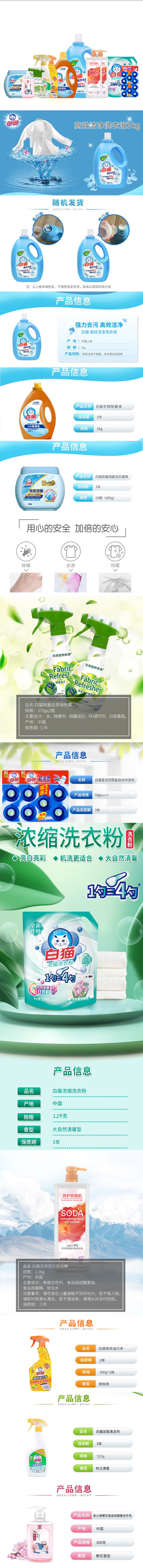 白猫家居衣物清洁大礼包26.3斤 白猫高效洁净洗衣液3kg*1 白猫 天然苏打洗洁精 1.1kg*2 白猫 新浓缩洗衣粉 1.2kg*2 白猫 除菌除螨洗衣凝珠8g*50颗*1 白猫 泉の语樱花滋润健康洗手液 300g*1 白猫衣物除菌液1kg*1 白猫 强效油污净 500g*1 白猫 浴室清洁剂 520g*1 白猫除菌去异味喷雾370g*2 白猫 蓝洁灵厕盆自动冲洗剂 50g*10