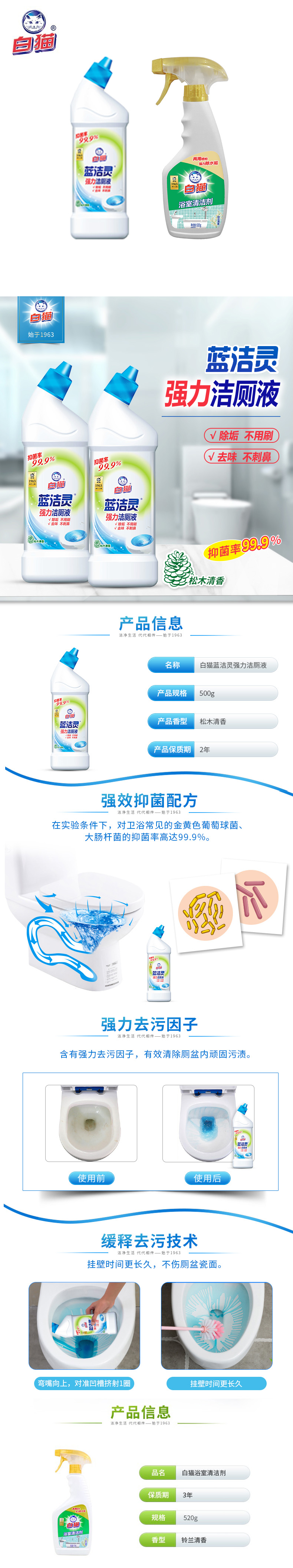 商品名称:白猫浴室清洁剂520g+蓝洁灵强力弯头洁厕液500g