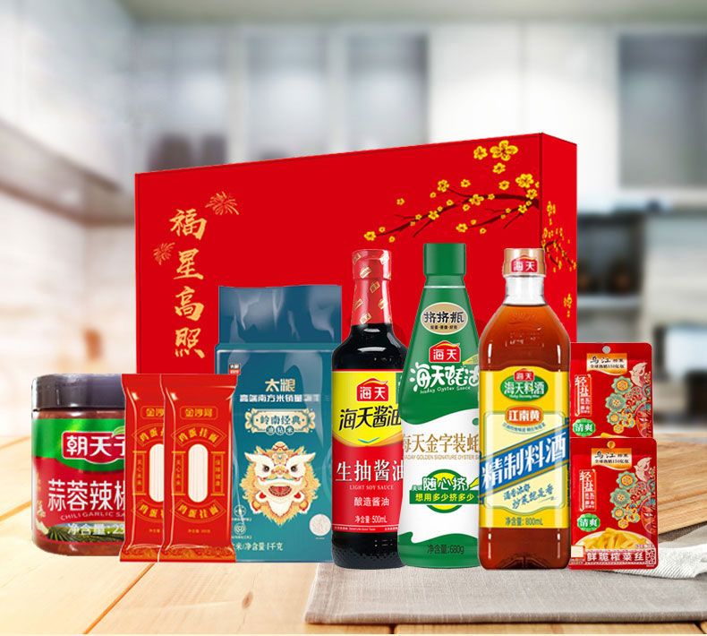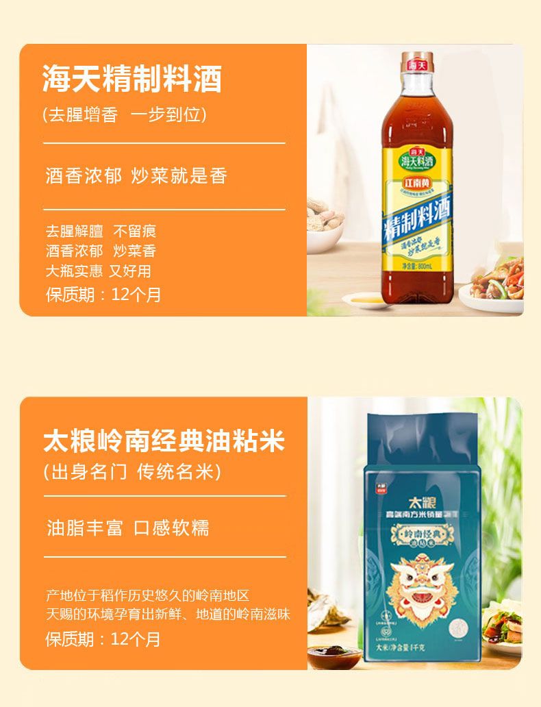 海天生抽酱油500ml*1 +海天金字装蚝油680g*1+海天精制料酒800ml*1+太粮岭南经典油粘米1kg*1+乌江鲜脆榨菜丝70g*2+金沙河鸡蛋挂面300g*2+朝天子蒜蓉辣椒酱230g*1