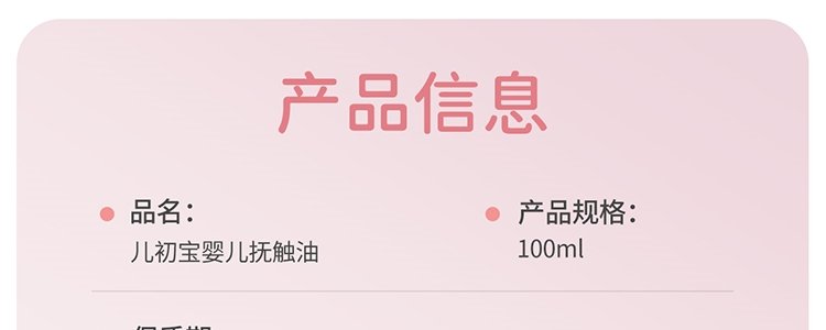 商品名称:【买赠】儿初宝(BABETRUE)宝宝舒缓抚触油 100ml*2瓶 赠小样20ml
