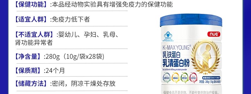 商品名称:恩优益(NUE K-MAXYOUNG)乳铁蛋白乳清蛋白粉 280g/罐