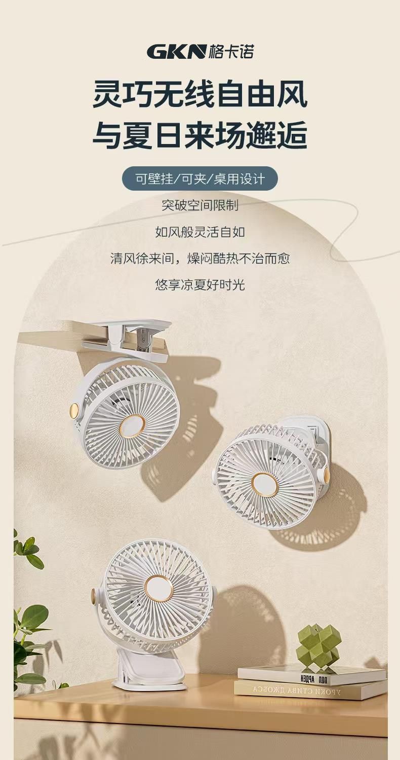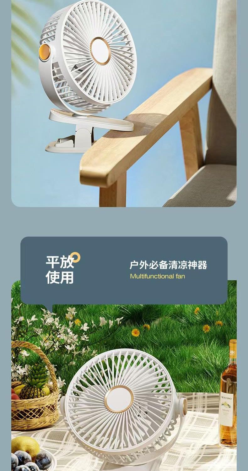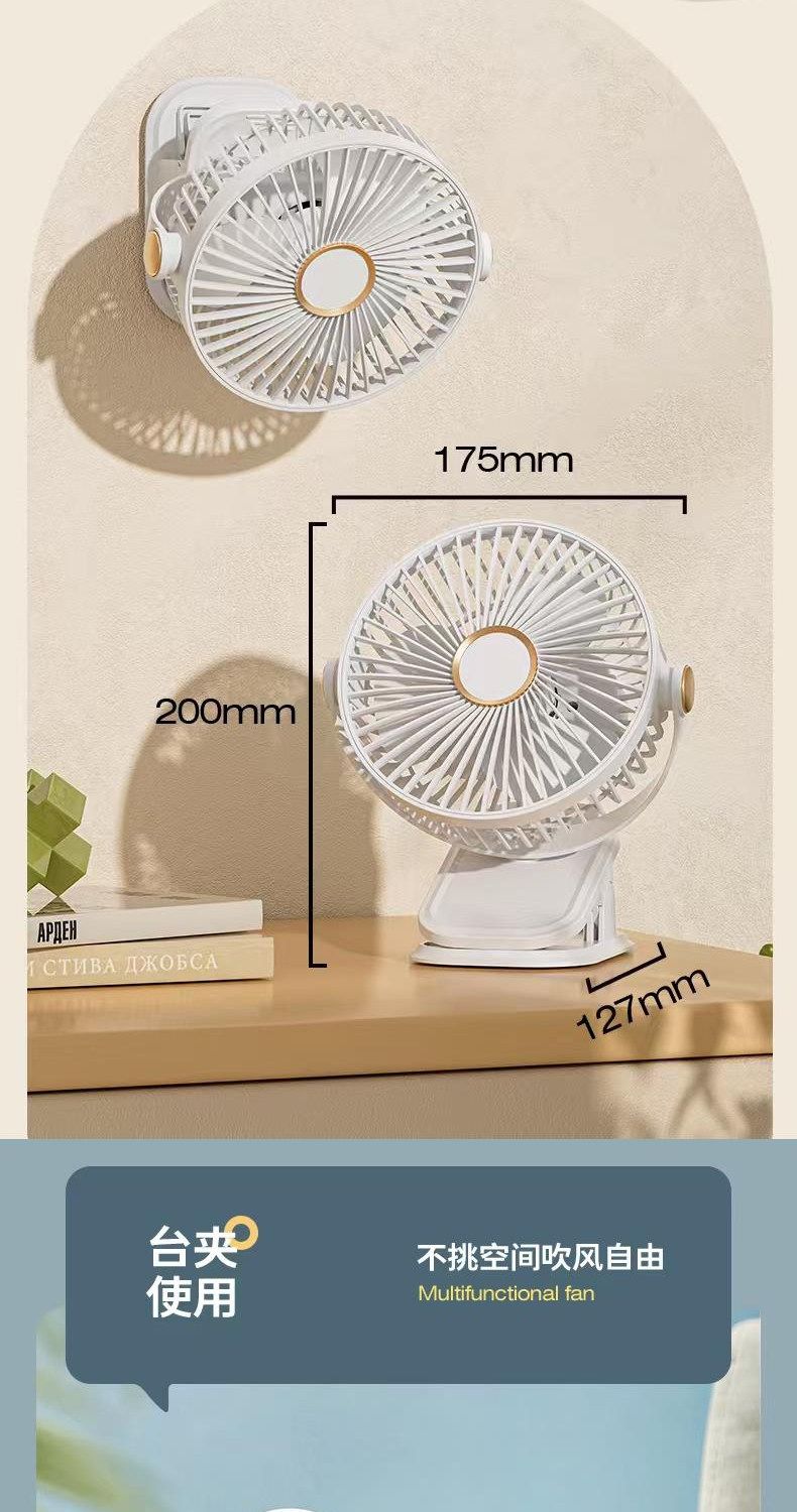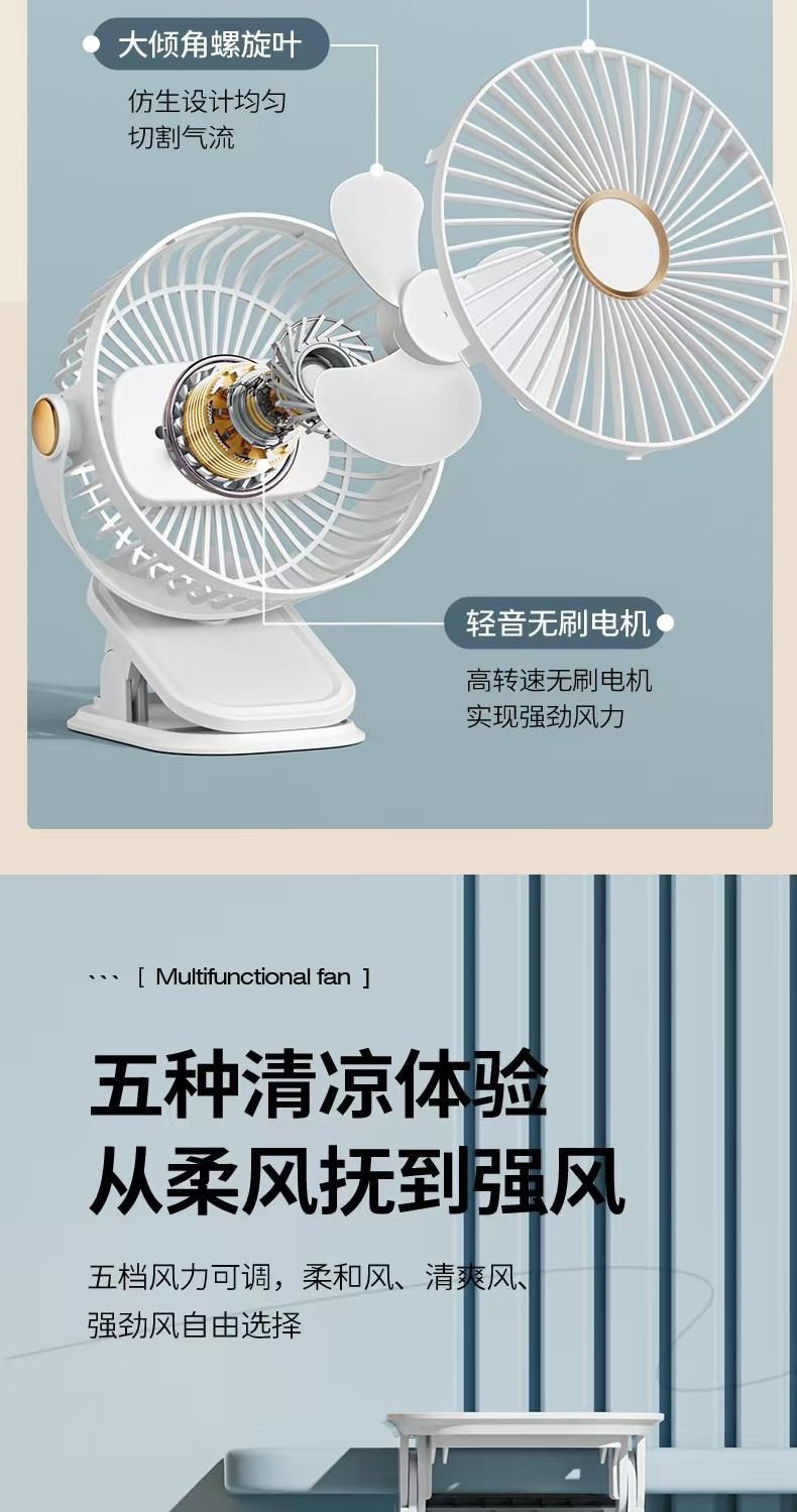 商品名称:格卡诺夹式风扇宿舍静音制冷小风扇USB直插款桌面夹扇大风力白色充电款带灯光