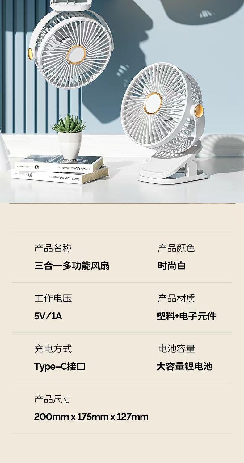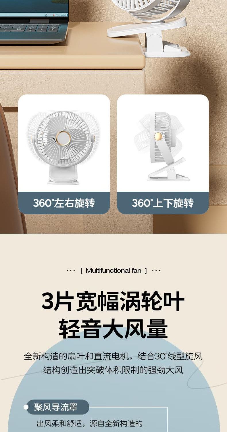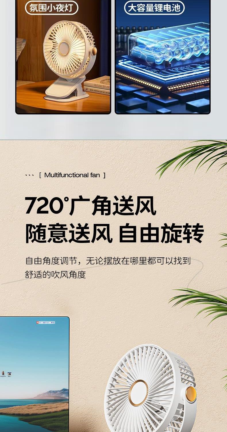 商品名称:格卡诺夹式风扇宿舍静音制冷小风扇USB直插款桌面夹扇大风力白色充电款带灯光