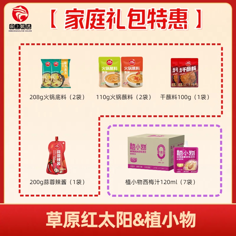 火锅底料208g*5(任意口味)+火锅蘸料165g*6(任意口味)+蒜蓉辣酱200g+芝麻酱200g+植小物西梅汁果饮120ML*7【火锅专家礼盒】