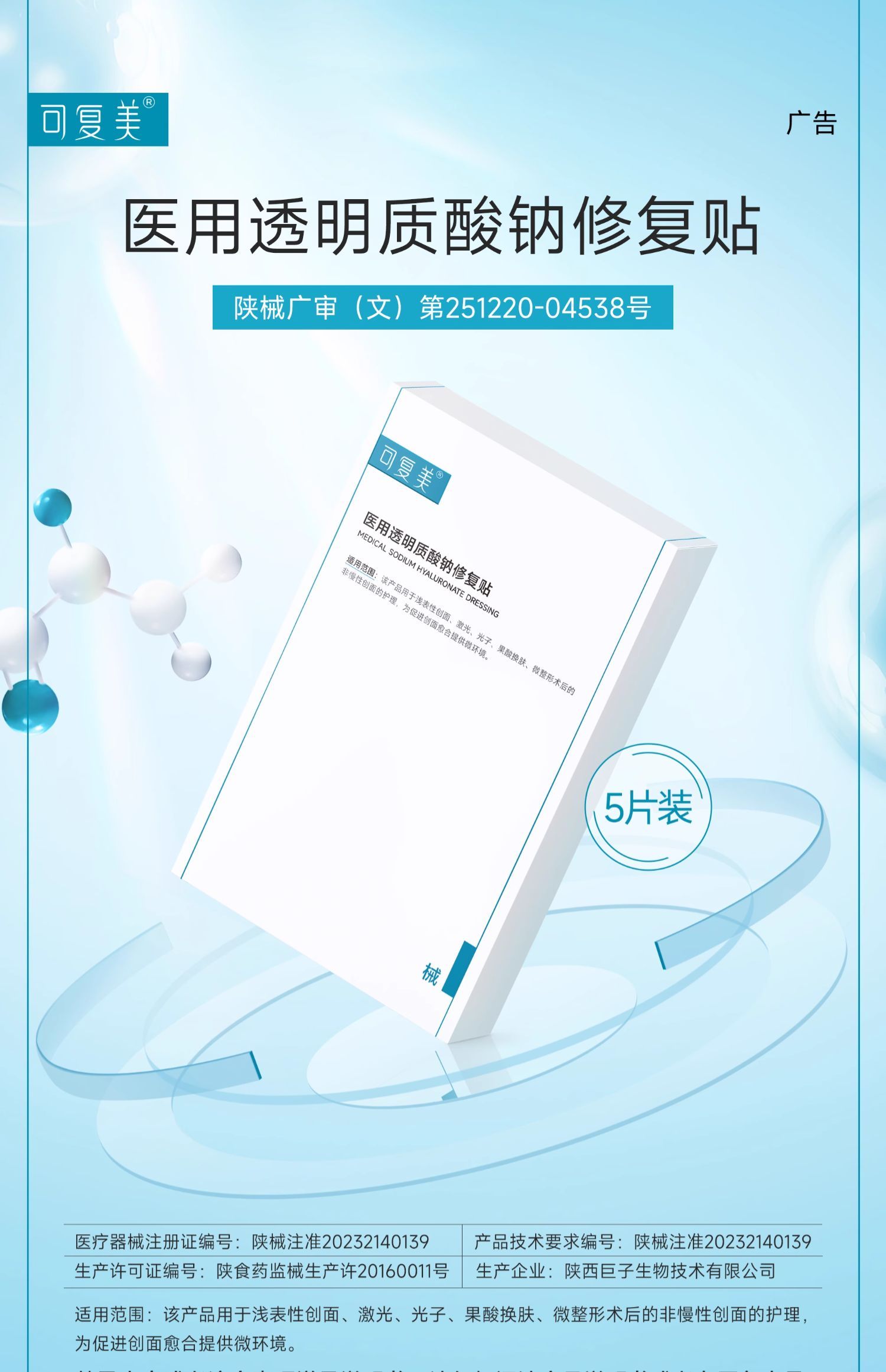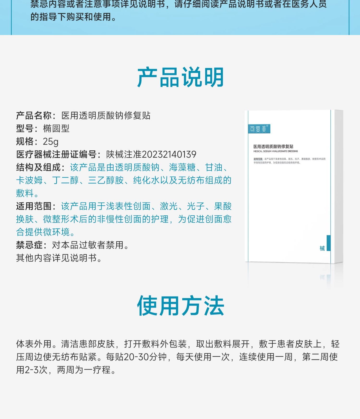 商品名称:可复美 医用透明质酸钠修复贴25g/片×5片/盒