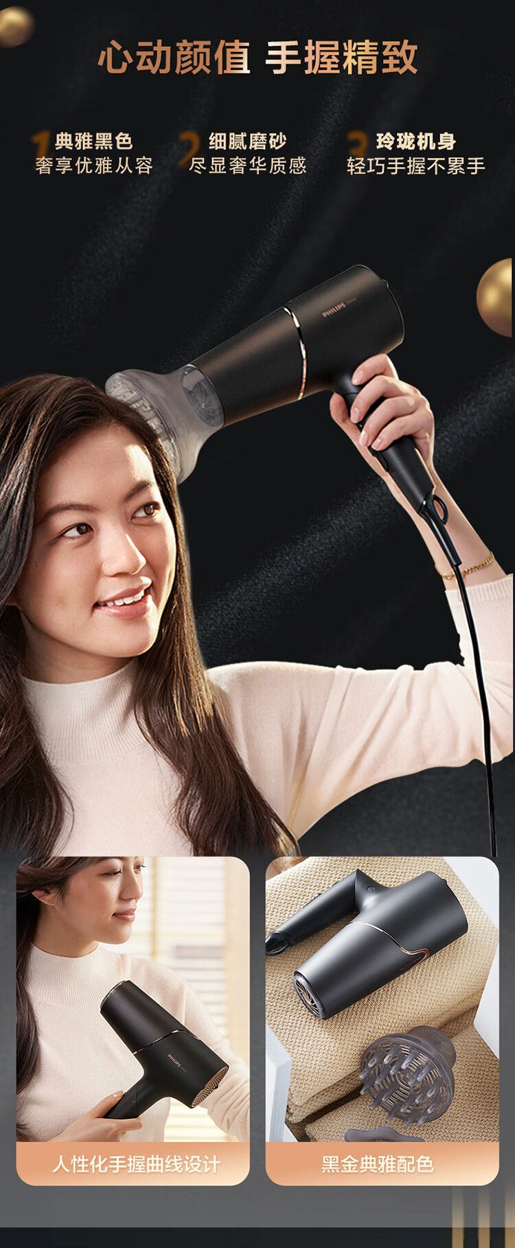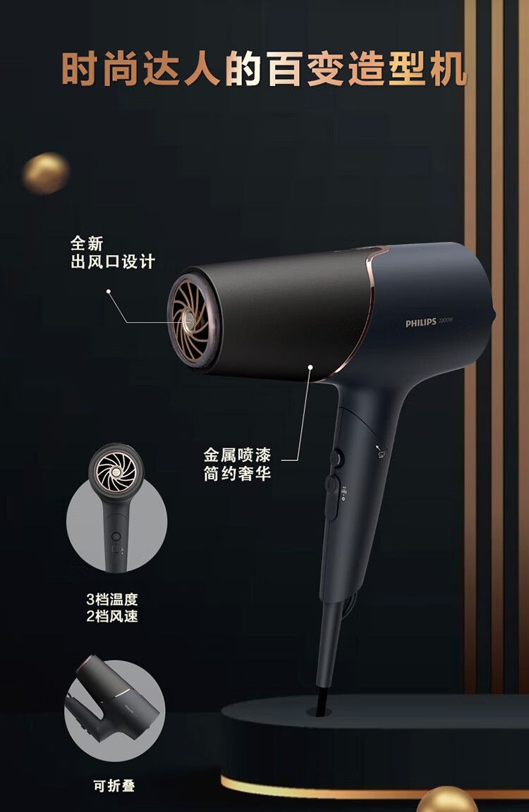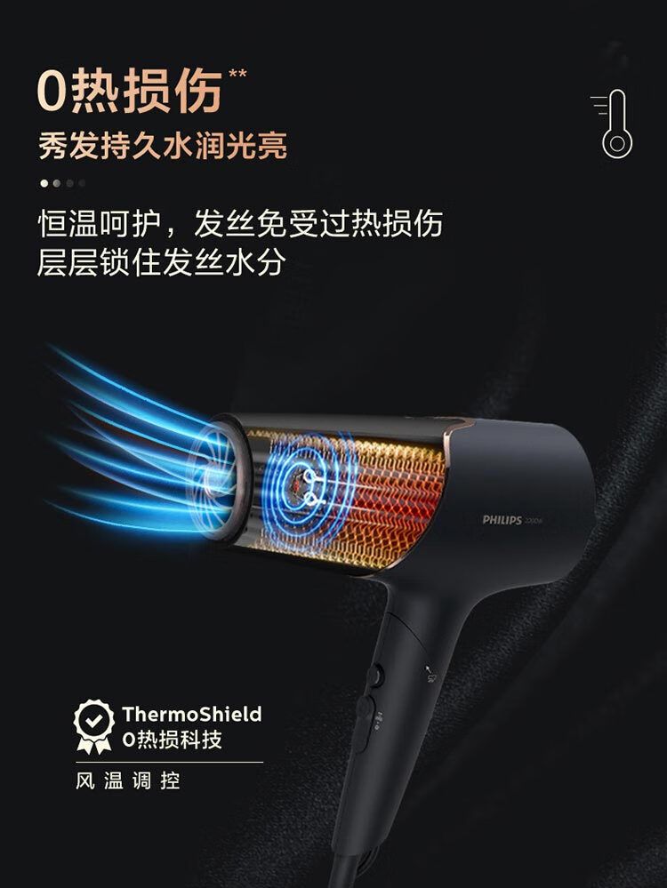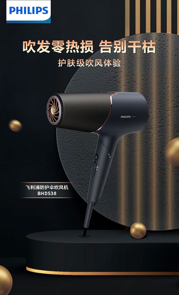 商品名称:飞利浦电吹风机 BHD538/25黑色 温感焕护4000万负离子 矿物质锌离子大功率速干 蓬松高颅顶