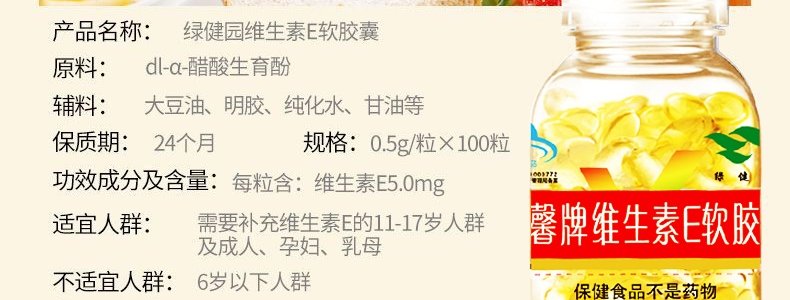 商品名称:绿健园 靓馨牌 维生素E软胶囊 100粒