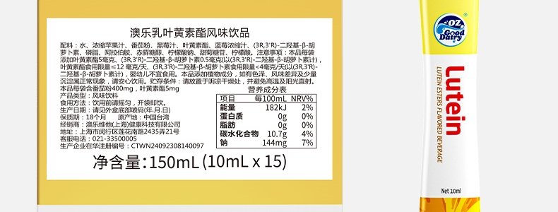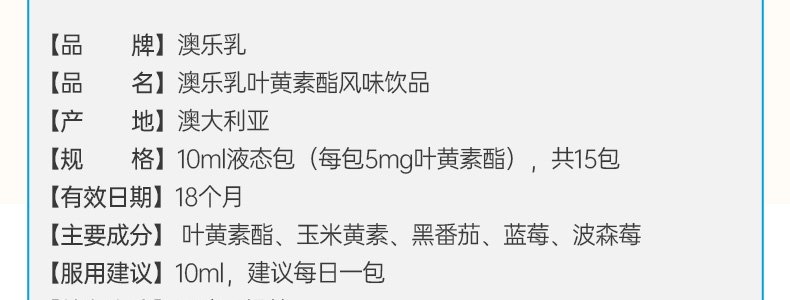 商品名称:【特价】澳乐乳(Oz Good Diary)叶黄素脂风味饮品 10ml*15包/盒