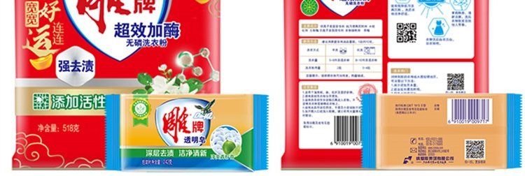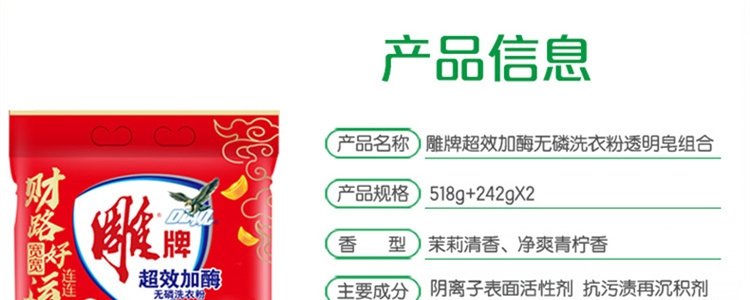 商品名称:雕牌 超效加酶洗衣粉 518g+透明皂 242g*2块