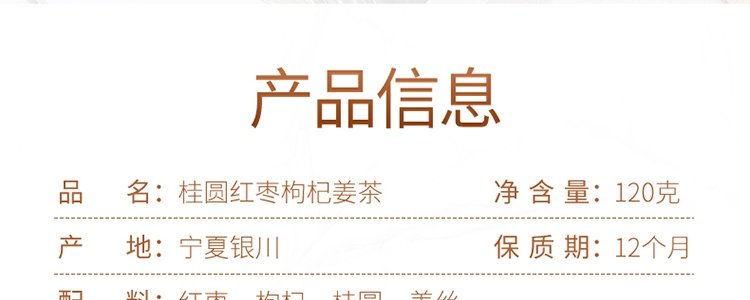 商品名称:杞里香 桂圆红枣枸杞姜茶 120g
