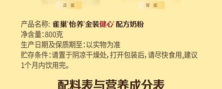 商品名称:雀巢 怡养金装健心配方奶粉 800g*2罐/盒 礼盒装