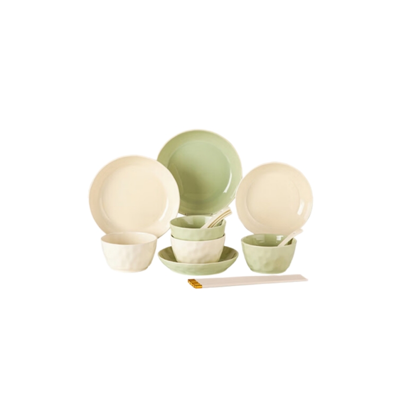 唯都马卡龙手捏纹陶瓷餐具16件套-松石绿+奶油黄W-CJ416