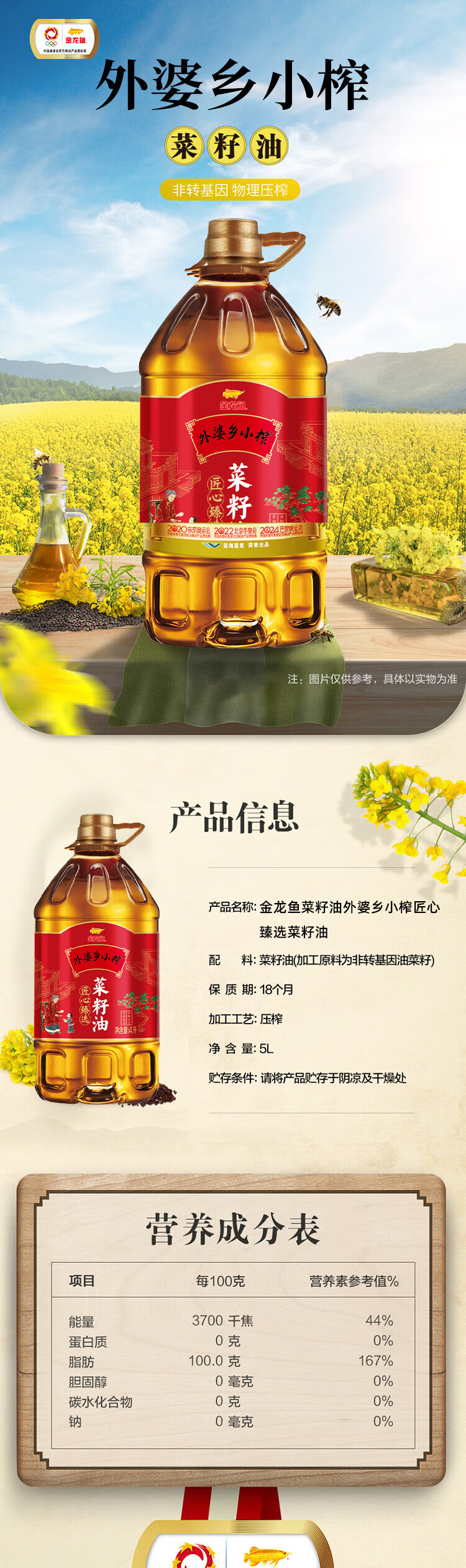 商品名称:金龙鱼外婆乡小榨匠心臻选菜籽油5L
