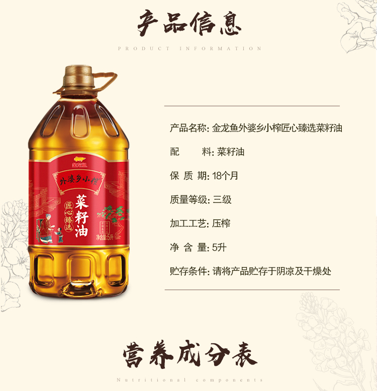商品名称:【京东/顺丰/德邦配送】金龙鱼外婆乡小榨匠心臻选菜籽油5L