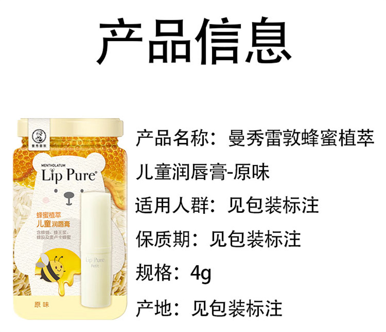 商品名称:曼秀雷敦蜂蜜植萃儿童润唇膏-原味4g