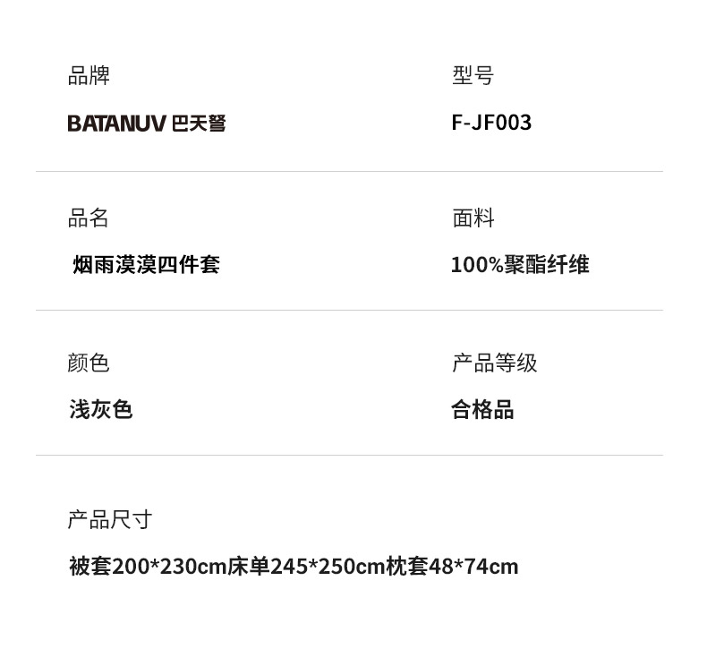 商品名称:BATANUV/巴天弩烟雨漠漠床品四件套200*230cm