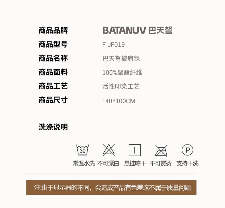 商品名称:BATANUV/巴天弩披肩毯140*100cm 200g