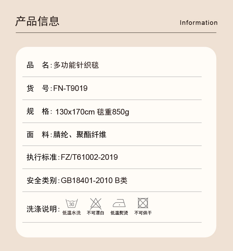 商品名称:faunen/芳恩多功能针织毯130*170cm 850g