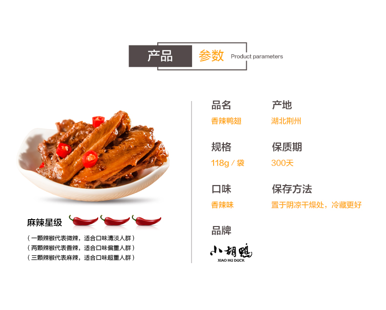 商品名称:XIAO HU DUCK/小胡鸭香辣味鸭翅118g*2袋