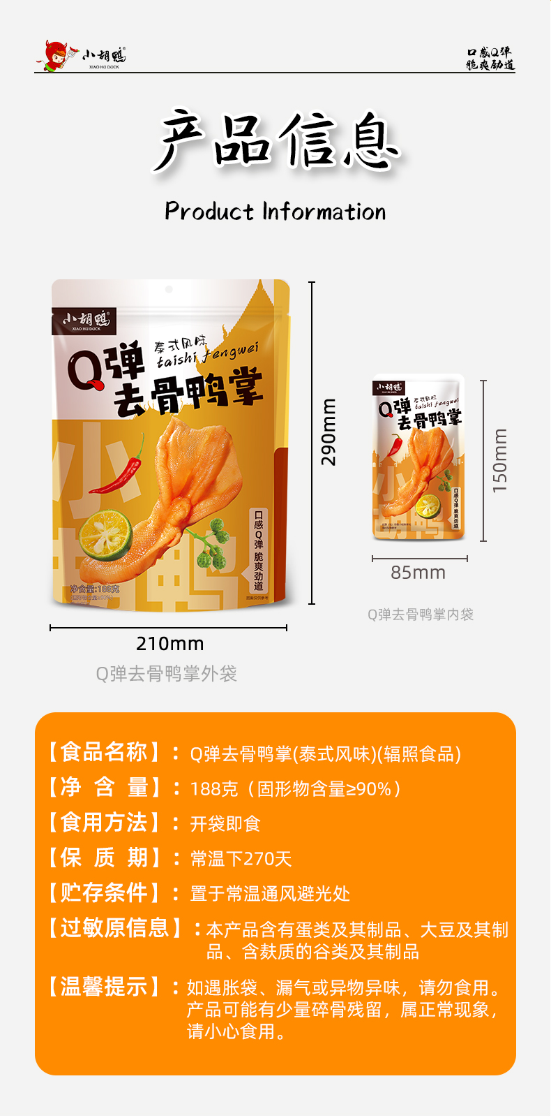 商品名称:XIAO HU DUCK/小胡鸭泰式风味Q弹去骨鸭掌188g