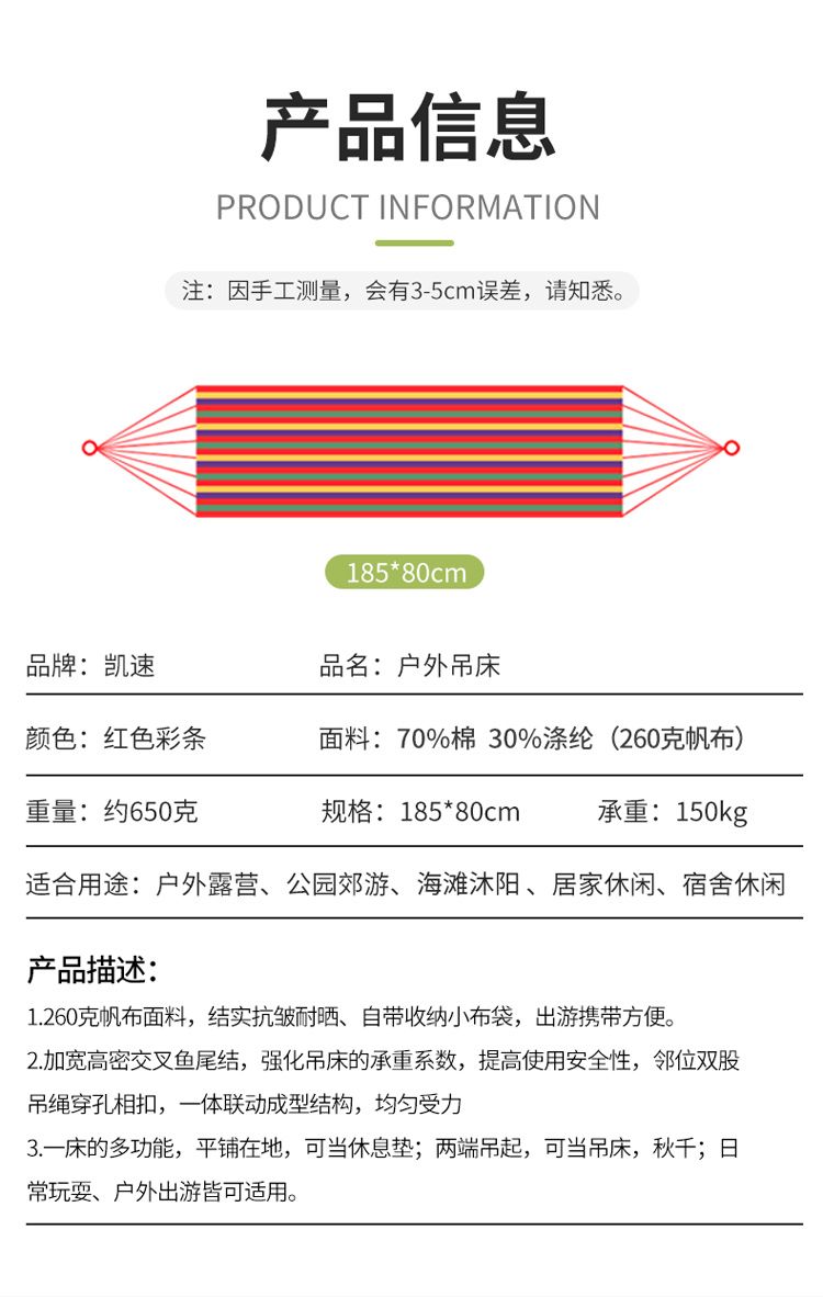 商品名称:凯速户外野营绑绳帆布吊床