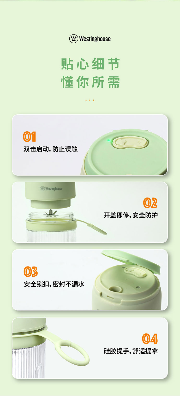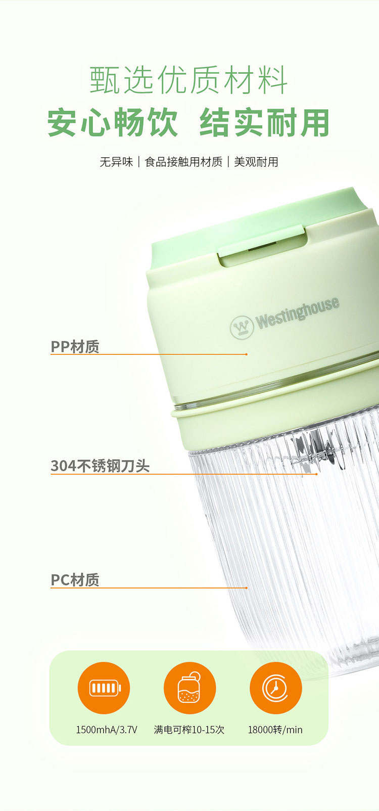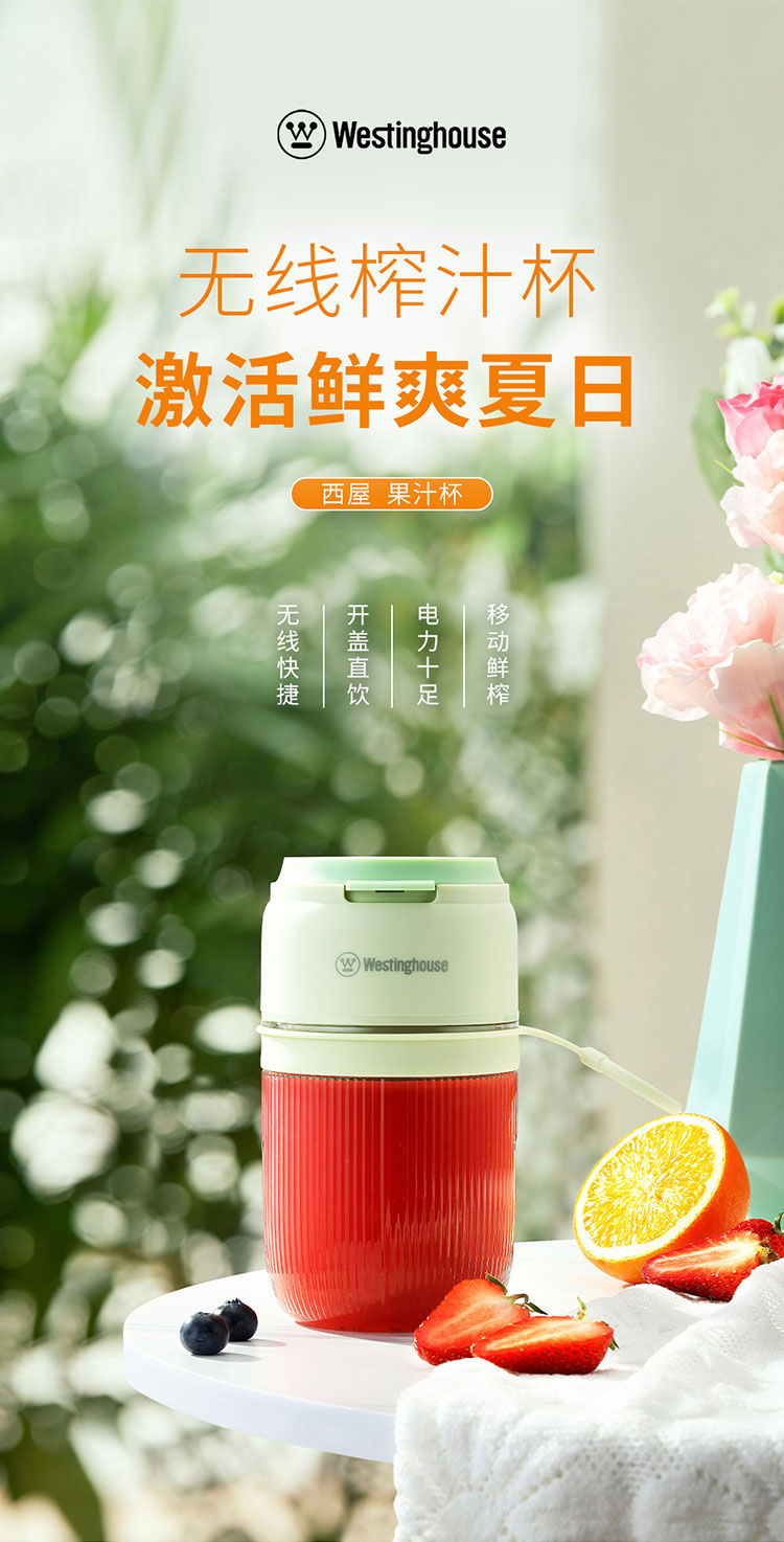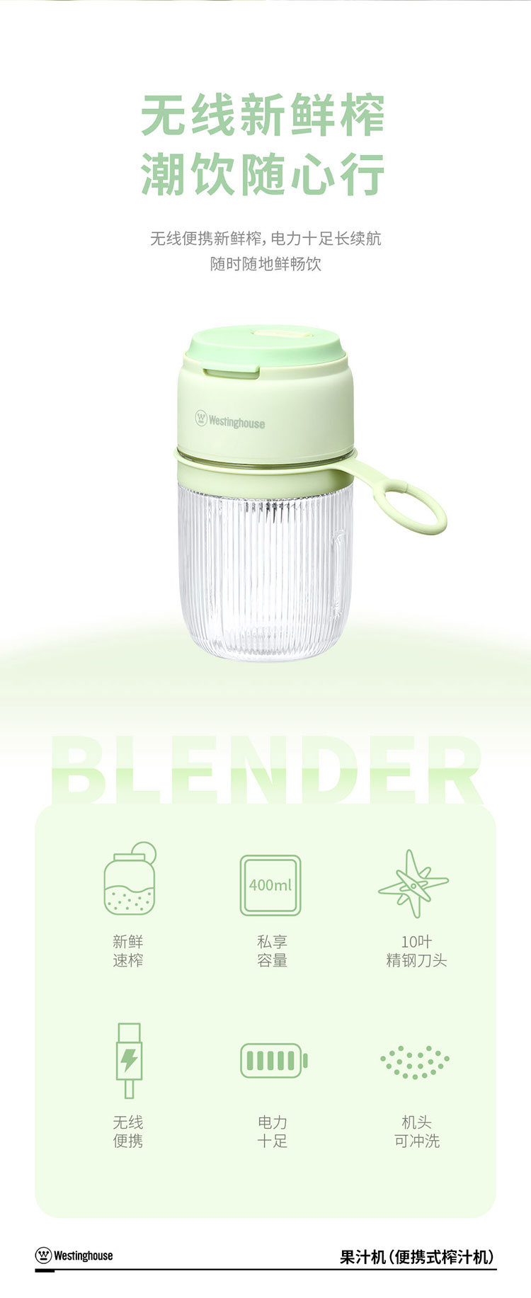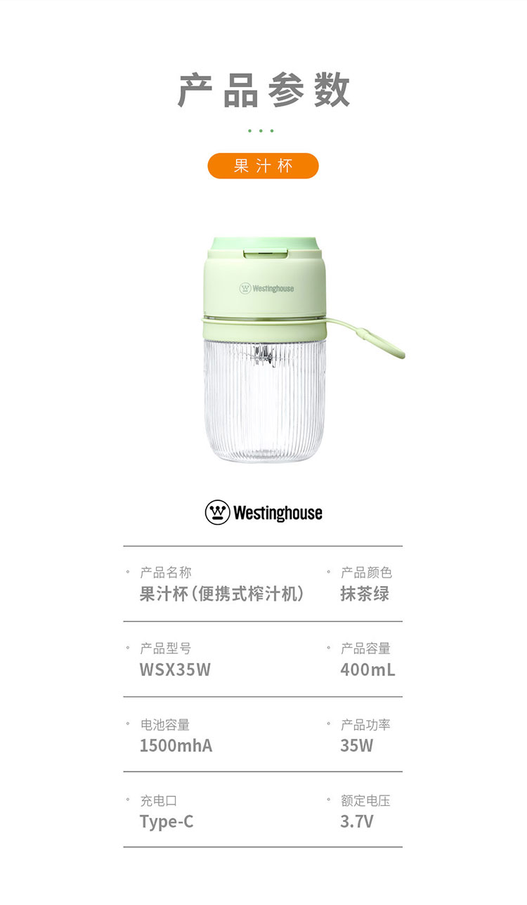 商品名称:Westinghouse/西屋400毫升便携式榨汁杯-抹茶绿WSX35W