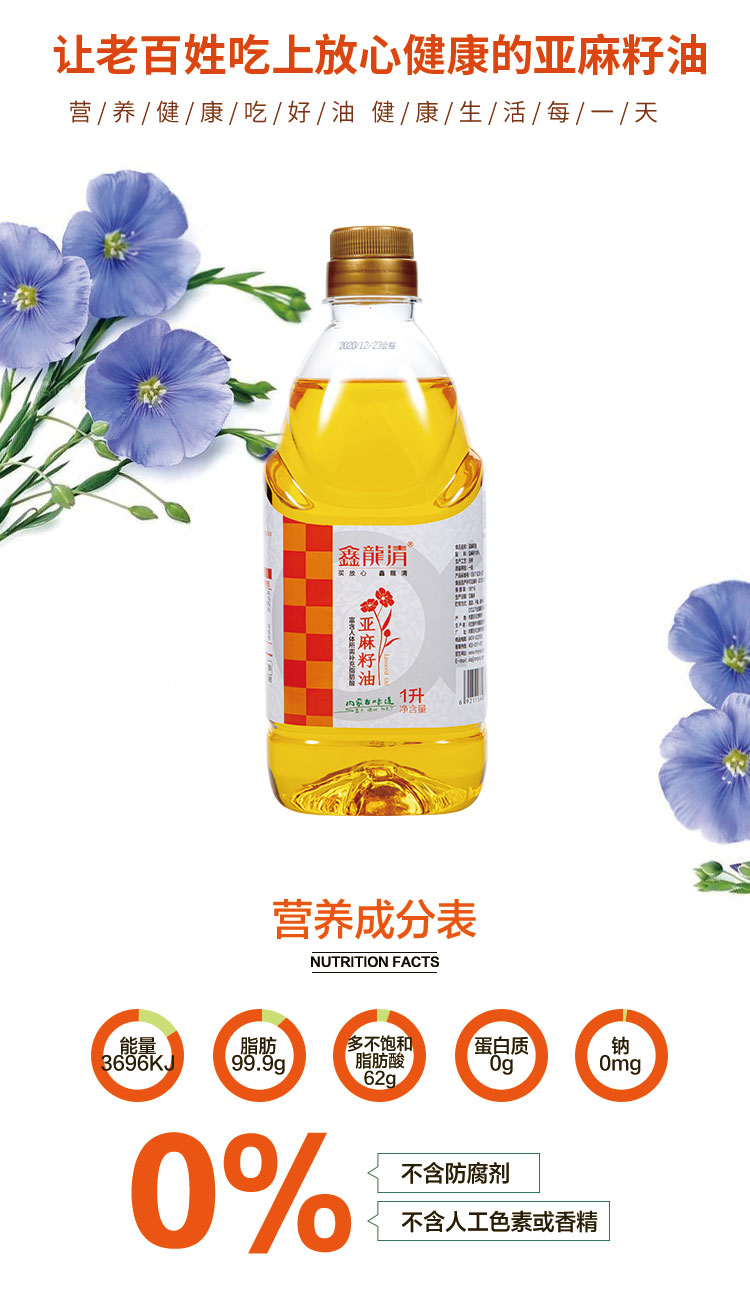 商品名称:鑫龍清一级冷榨亚麻籽油礼盒1L*2瓶
