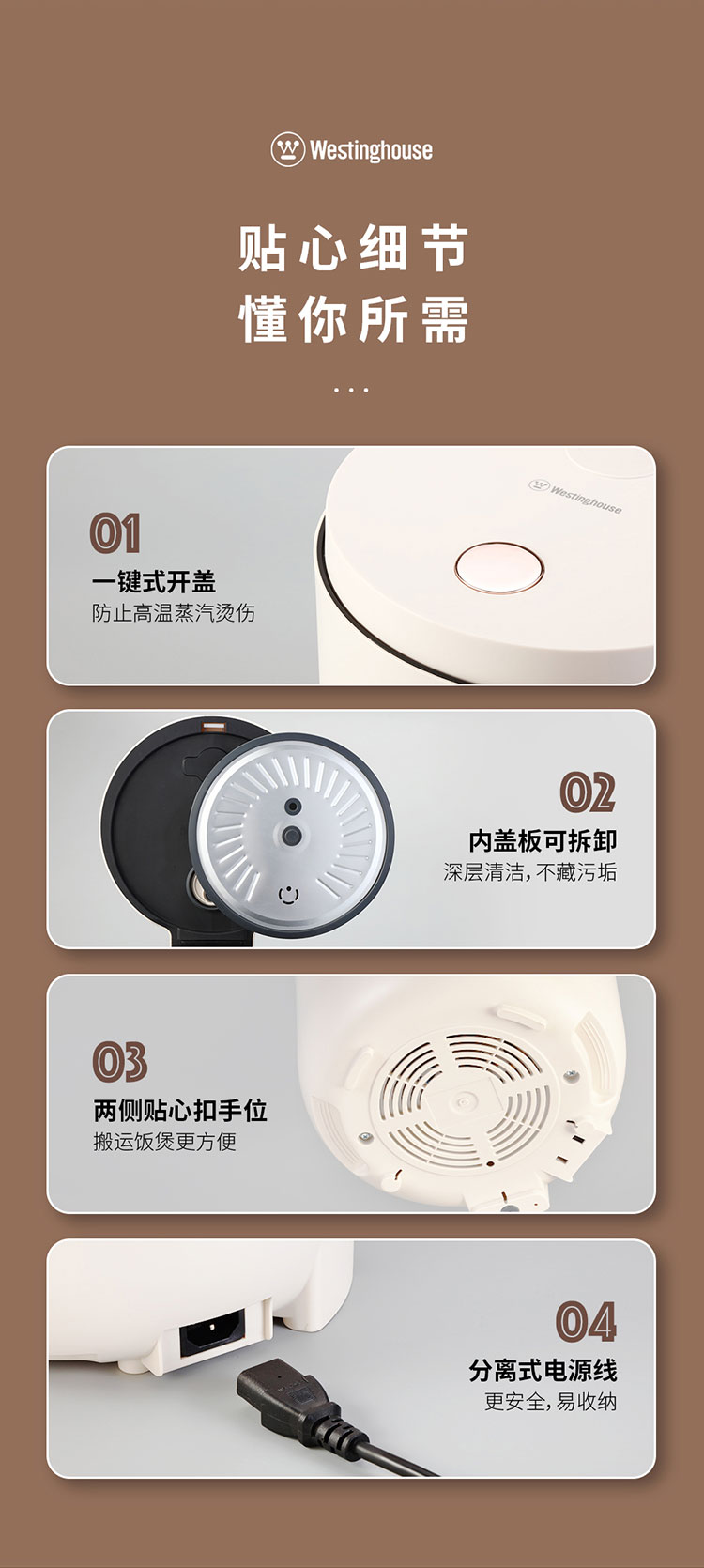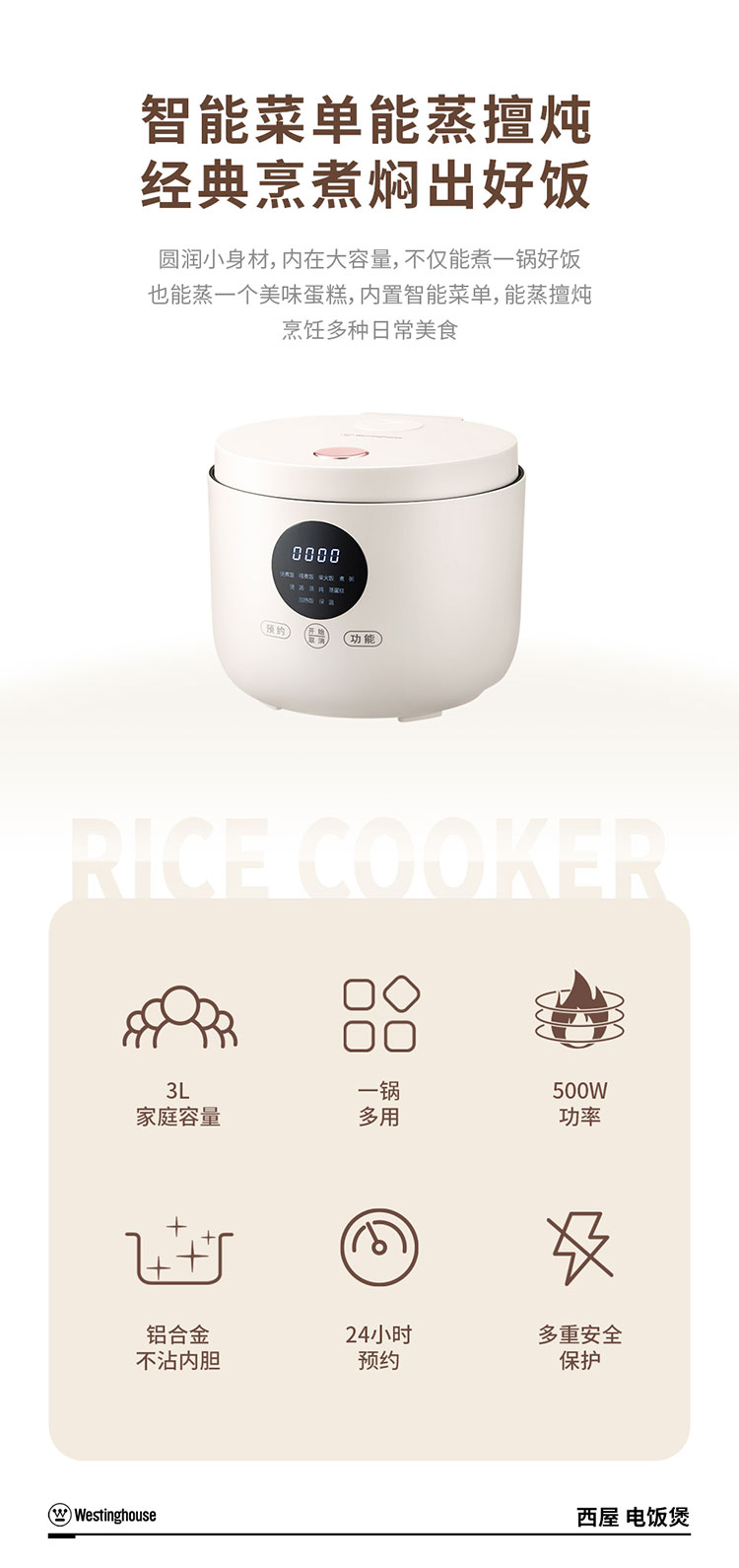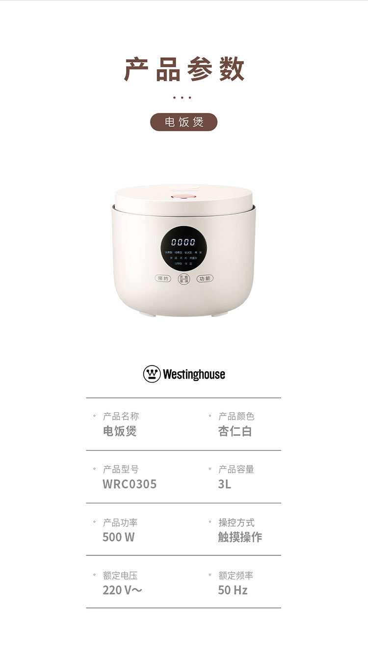 商品名称:Westinghouse/西屋3升电饭煲-杏仁白WRC0305