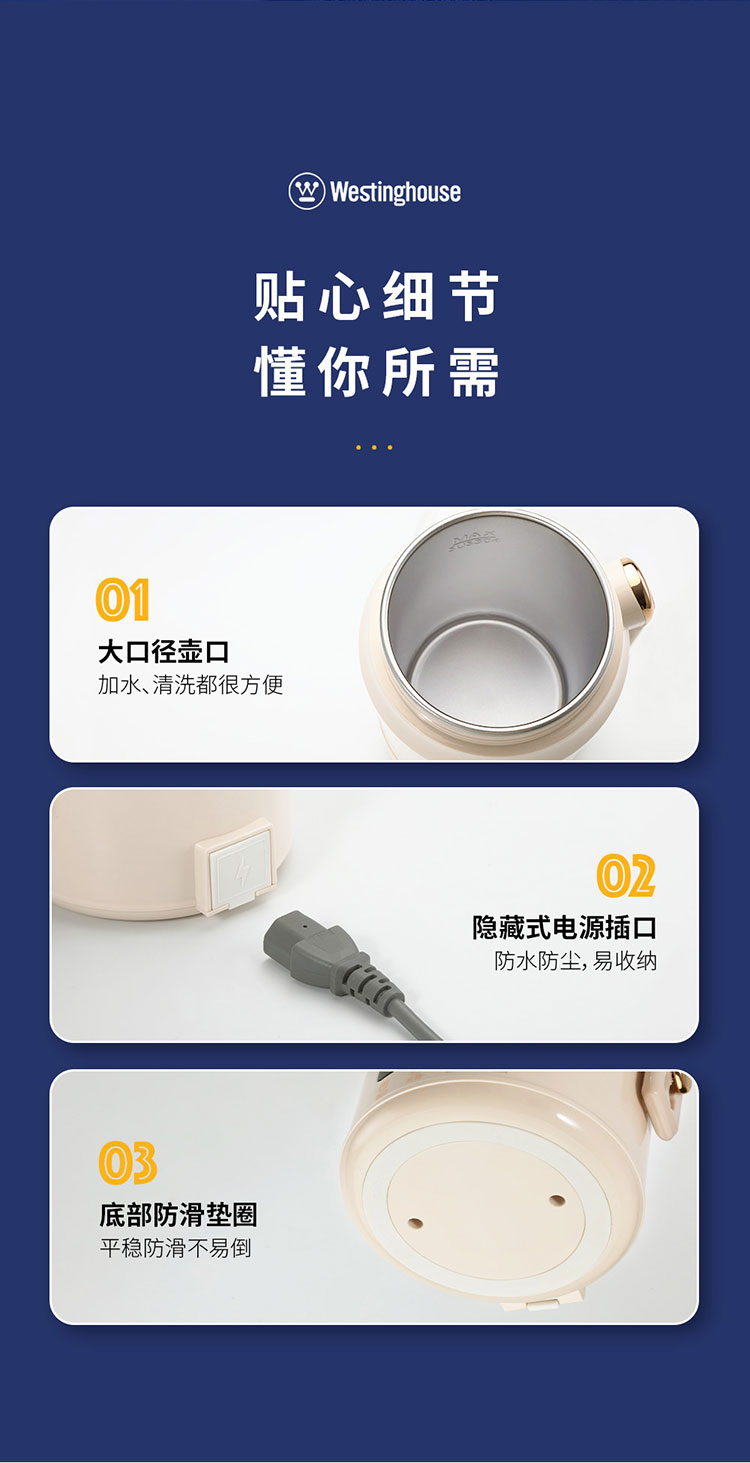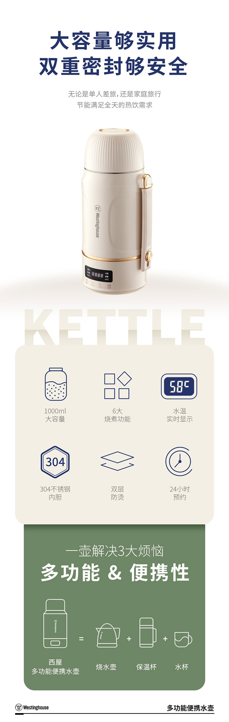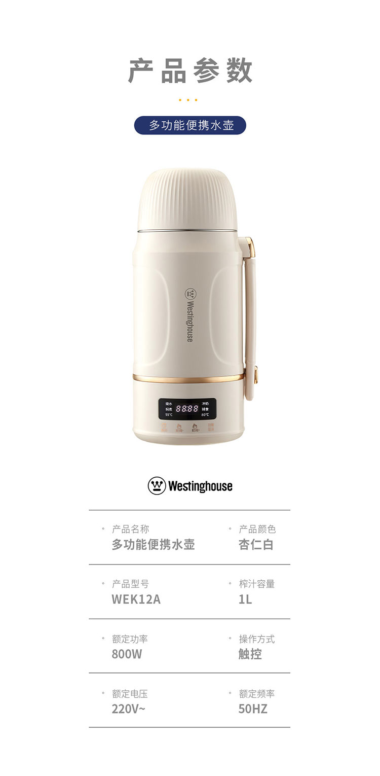 商品名称:Westinghouse/西屋1升多功能便携水壶-杏仁白WEK12A