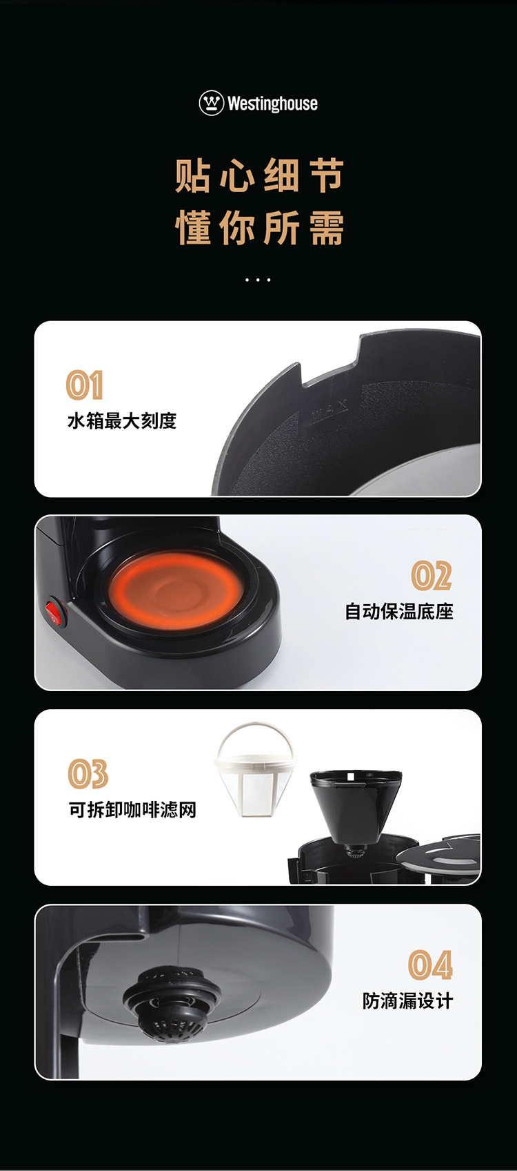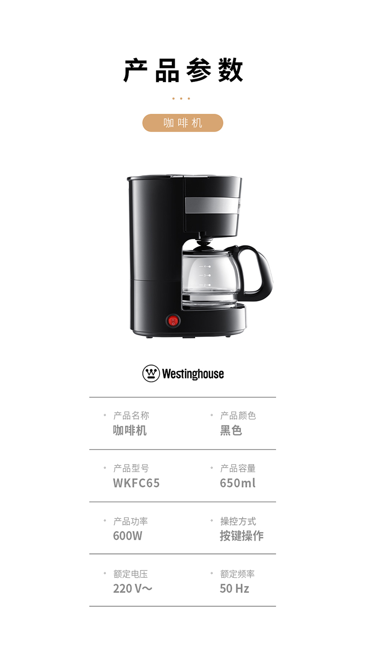 商品名称:Westinghouse/西屋650毫升咖啡机-黑色WKFC65