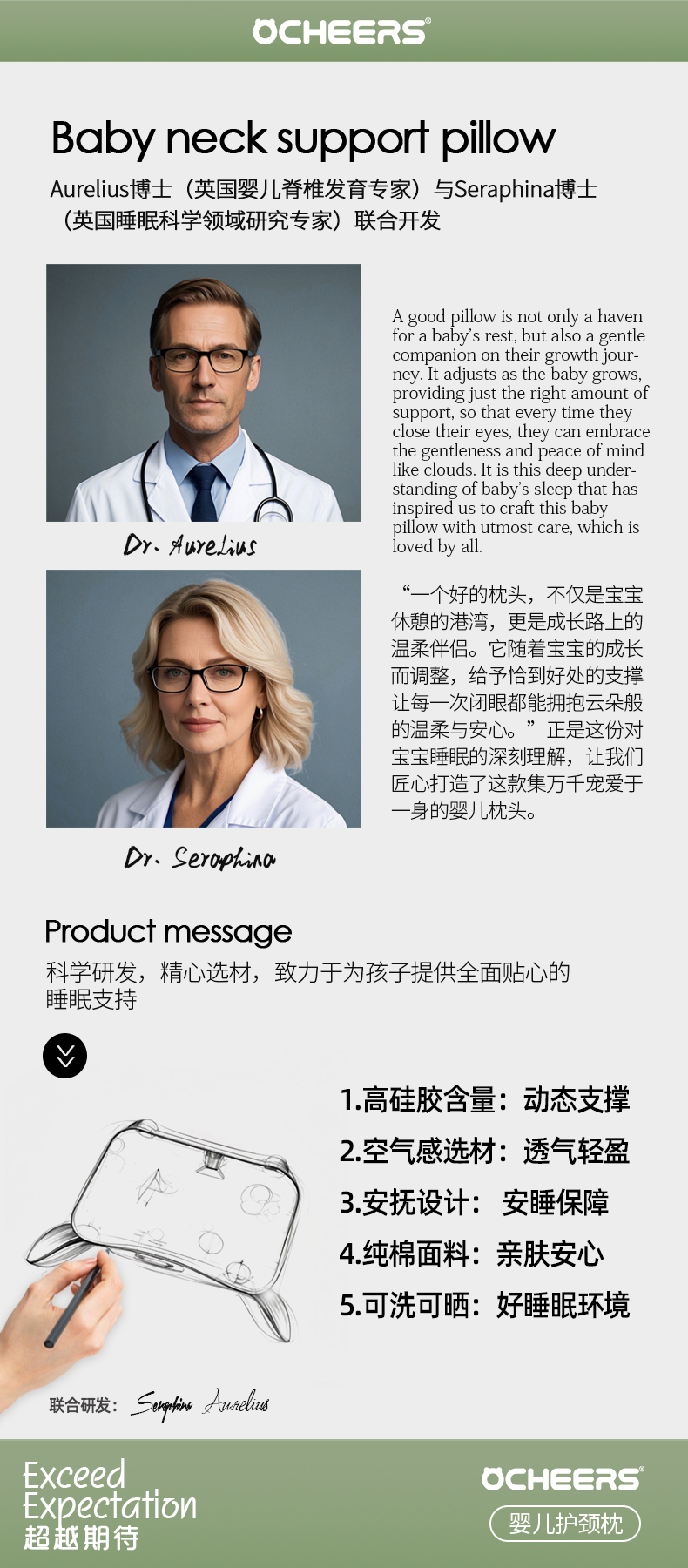英国好奇熊Ocheers儿童枕头0-6个月婴儿云片枕宝宝硅胶枕新生儿护颈枕