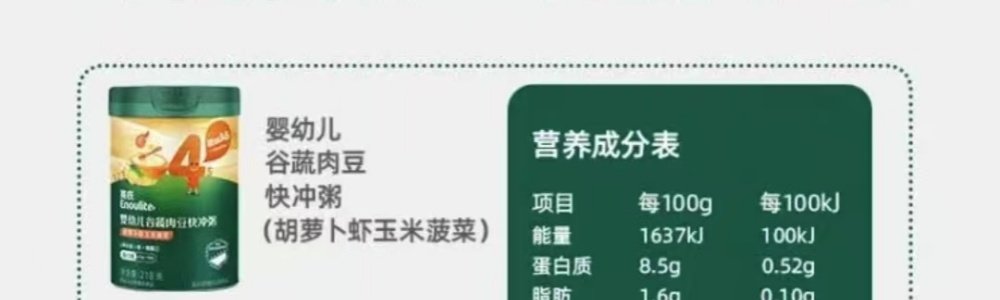 商品名称:【买赠】英氏(Enoulite)谷蔬肉豆快冲粥(胡萝卜虾玉米菠菜)175g/罐*2罐【赠弯曲叉勺+饼干20g*1】