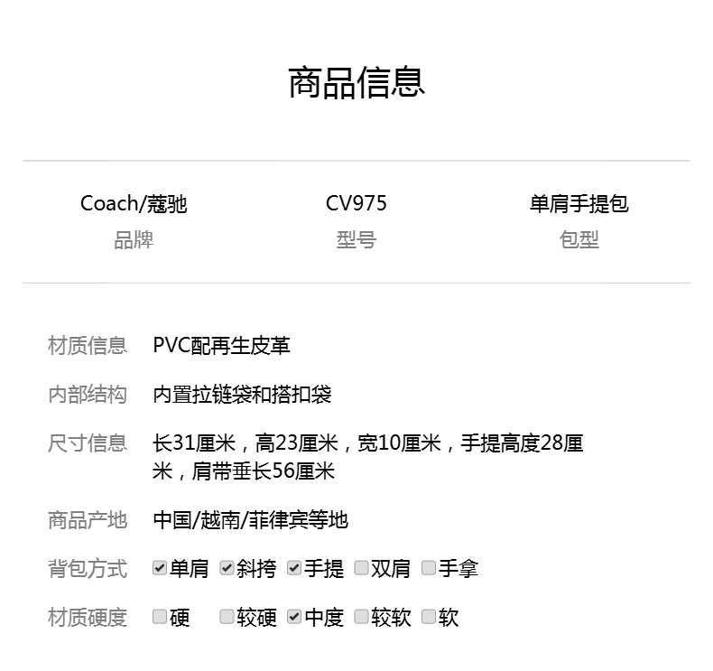 商品名称:COACH 奥莱款女士PVC配皮单肩斜挎手提包 CV975IMXU5