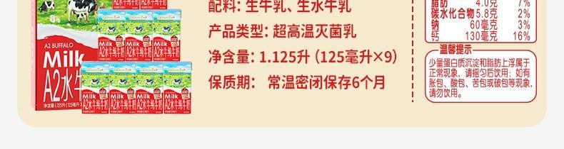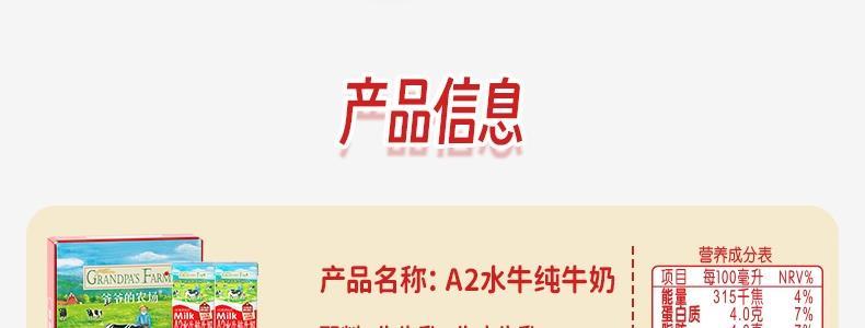 商品名称:爷爷的农场 A2水牛纯牛奶 125ml*9支*2箱