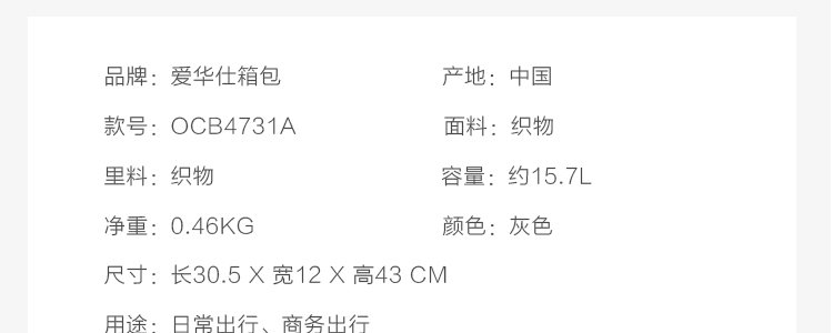 商品名称:爱华仕(OIWAS)商务出行背包 (带USB充电口)