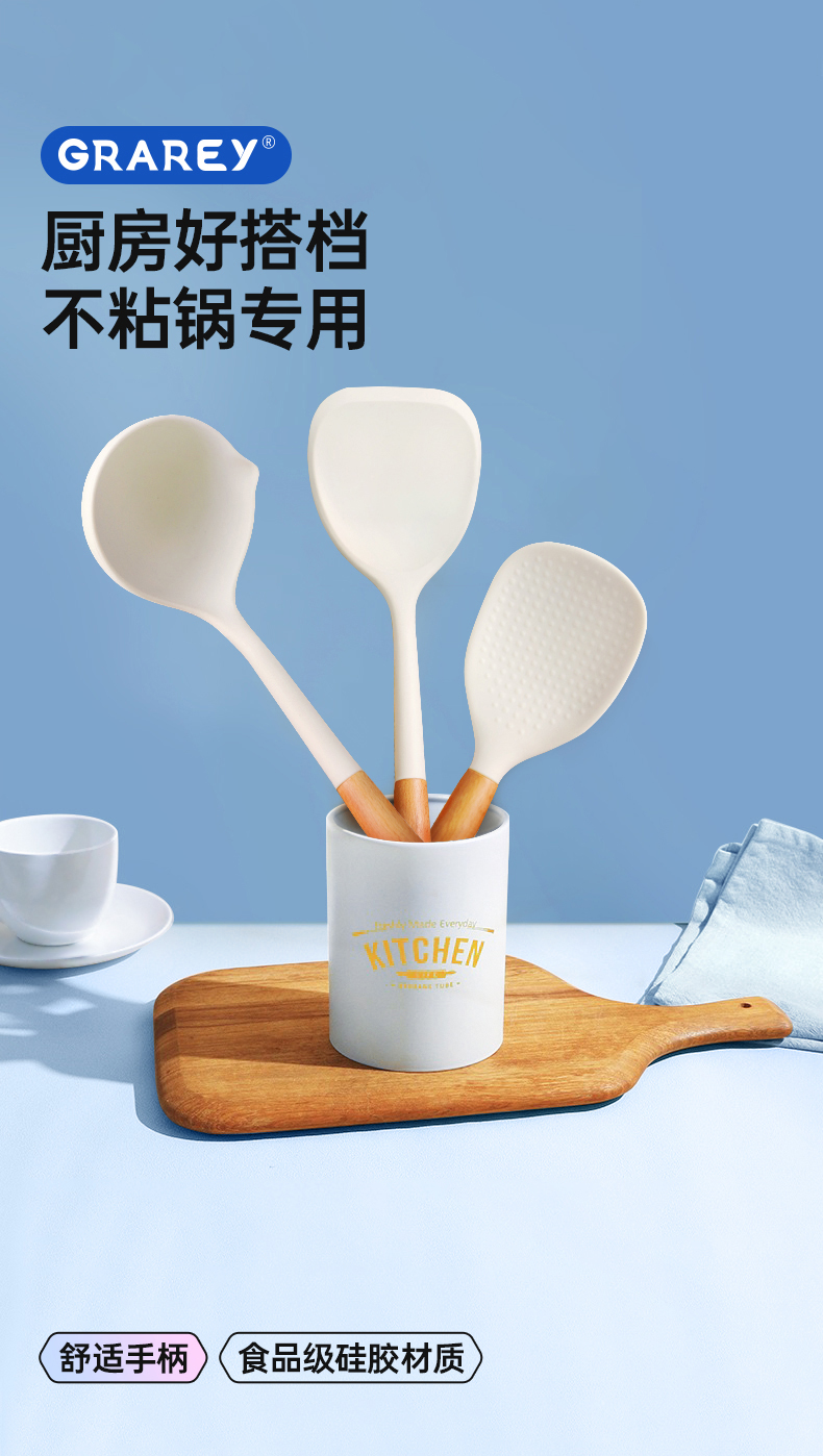 GRAREY/格瑞亚木柄锅铲三件套(锅铲+大汤勺+饭勺)