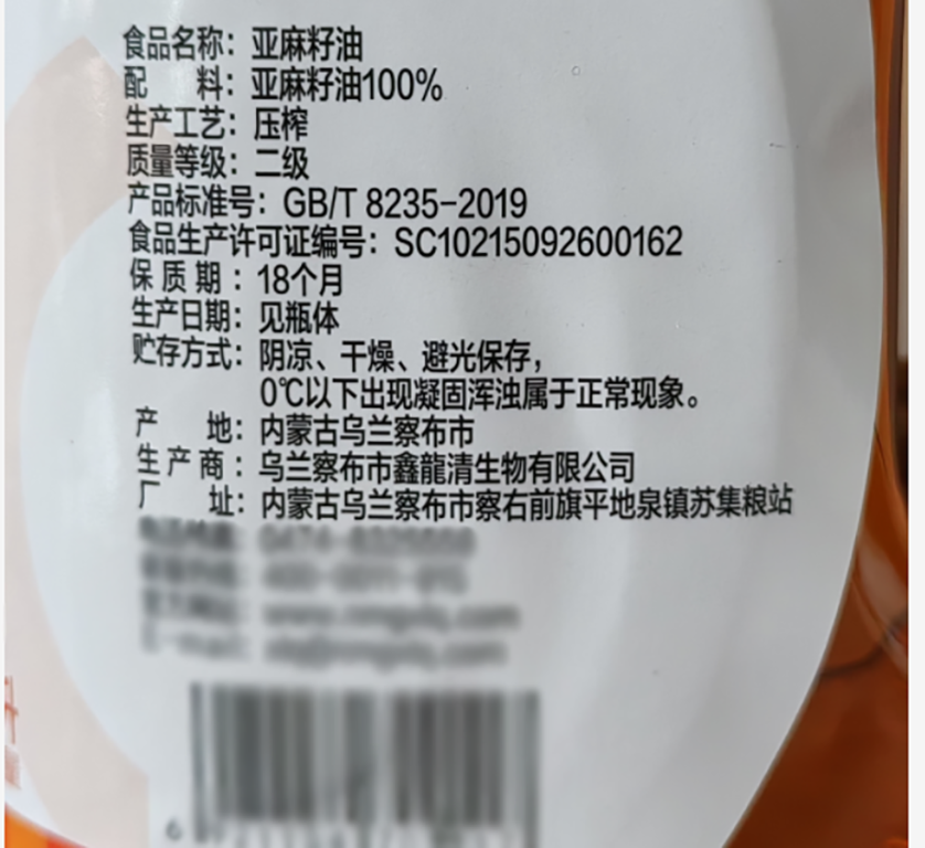 商品名称:鑫龍清热榨亚麻籽(胡麻)油5L