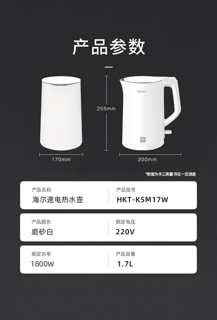 商品名称:【京东配送】Haier/海尔1.7升电热水壶HKT-K5M17W