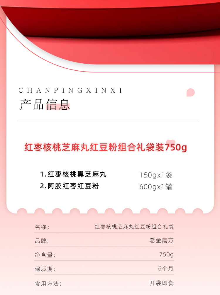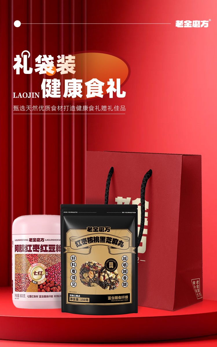 商品名称:老金磨方红枣核桃芝麻丸红豆粉组合礼袋装750g