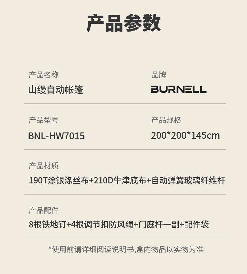 商品名称:BURNELL/巴米樂山缦自动帐篷BNL-HW7015