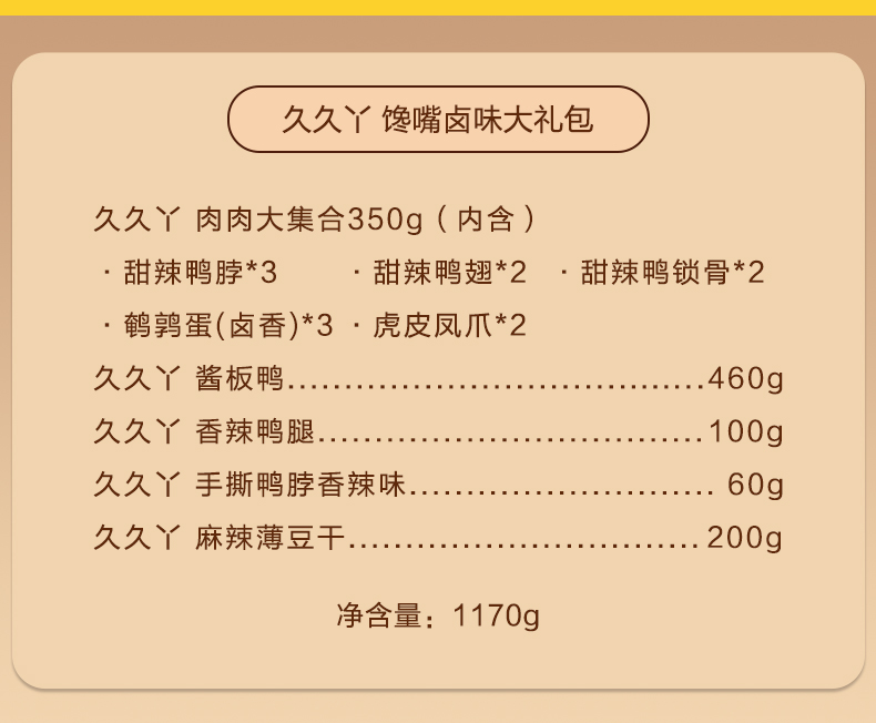 商品名称:久久丫馋嘴卤味大礼包188型1170g