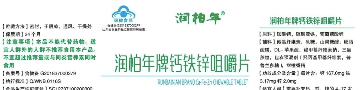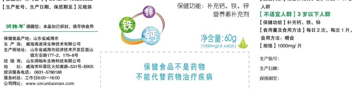 商品名称:润柏年 钙铁锌咀嚼片1000mg*60片