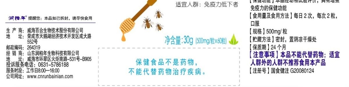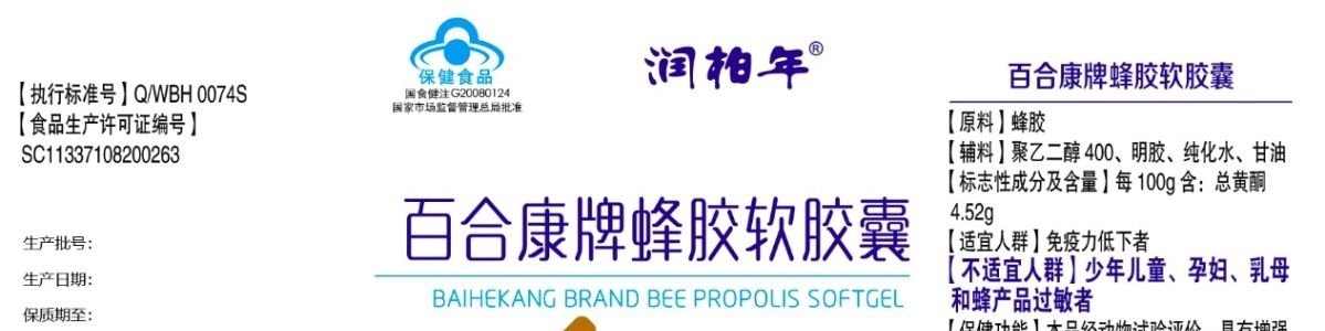 商品名称:润柏年 蜂胶软胶囊500mg*60粒