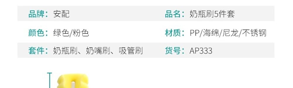 商品名称:安配 奶瓶水杯清洁套餐奶瓶刷5件套-绿色