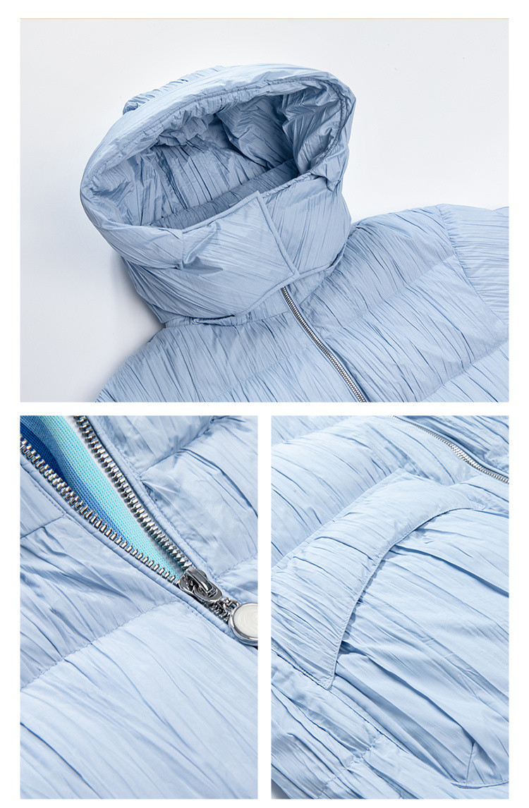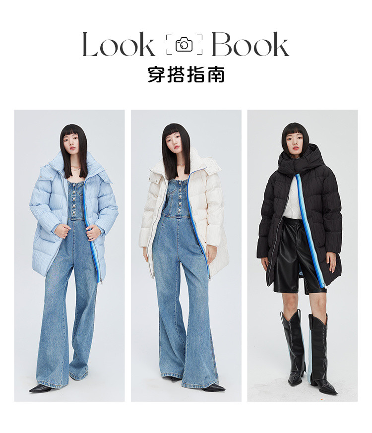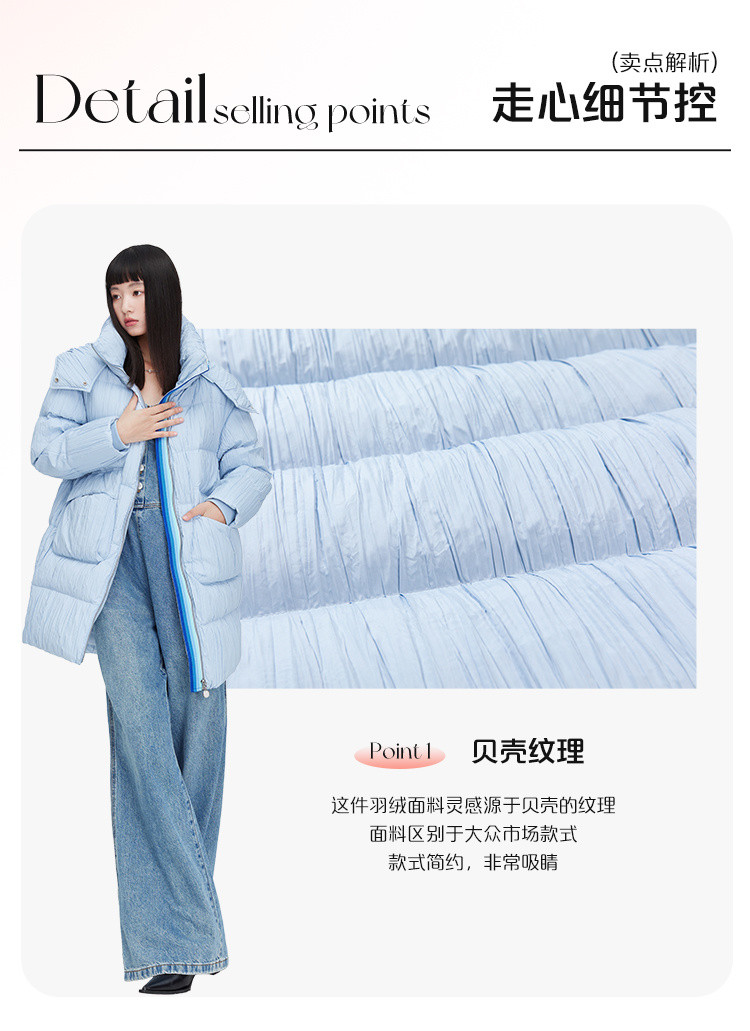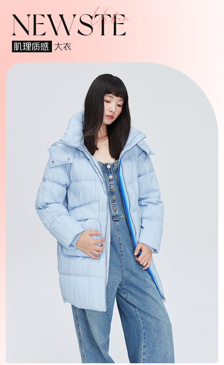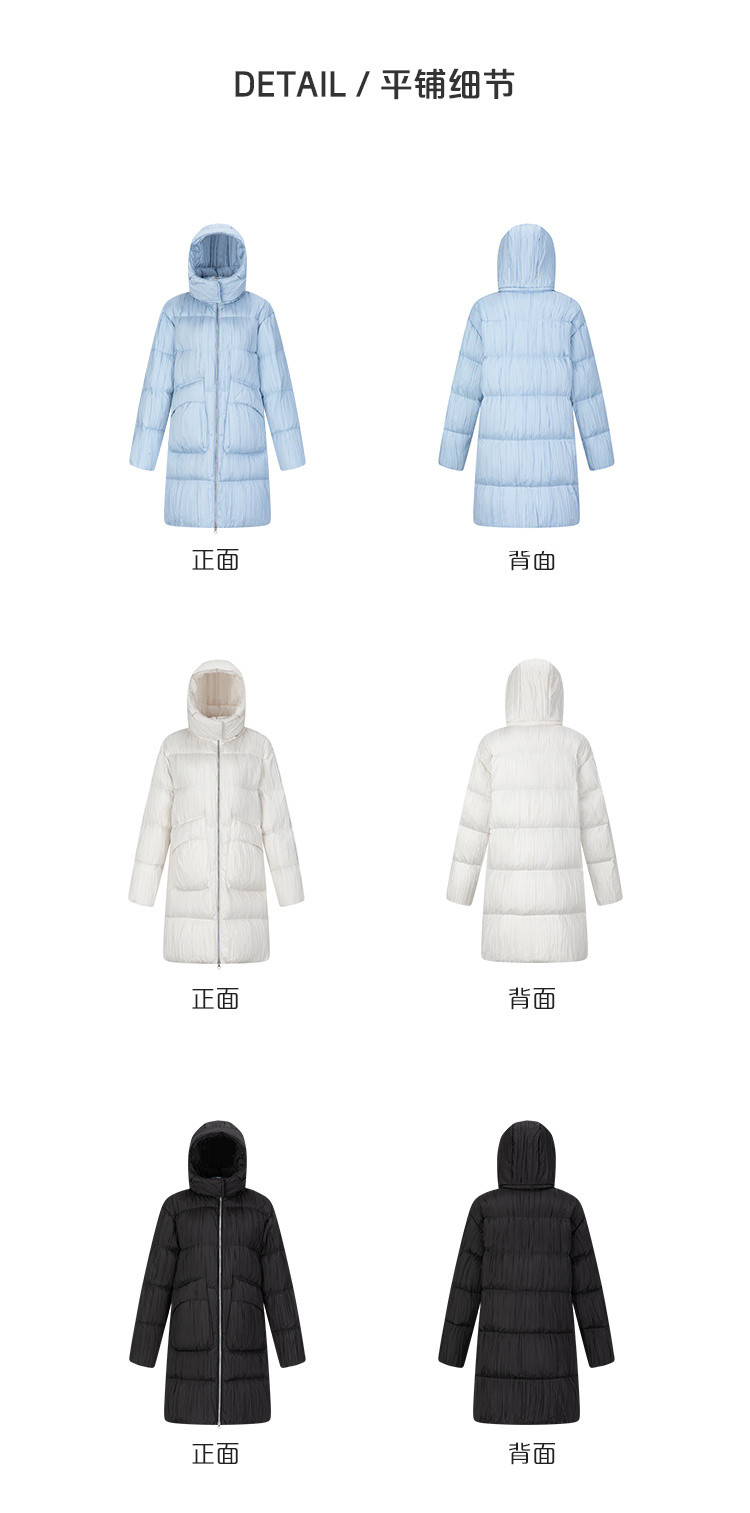 商品名称:【商场同款】时尚贝壳抽褶中长款羽绒服女御寒连帽鸭绒服女式外套 139606