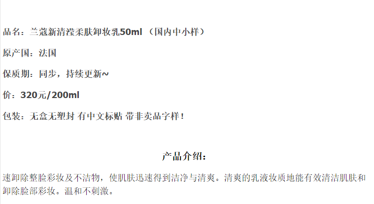 商品名称:Lancome/兰蔻 新清滢柔肤卸妆乳 50ml 适合中性偏干肤质 国内专柜版